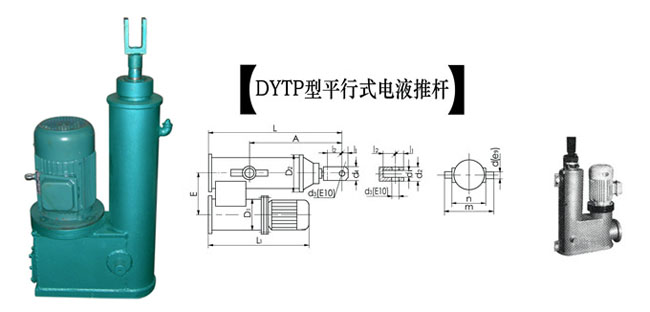 DYTP型平行式電液推桿是一種機、電、液、儀一體化的執行機構,它以液壓缸為主體,電動機、油箱、油泵、濾油器、液壓控制閥組合的總成。電動機、油泵、液壓控制閥和液壓缸可裝在同一軸線上,也可按需要裝置在不同軸上,中間有油箱和安裝支座,只需接通電動機的控制電源,即可使活塞桿位移往復運動。活塞桿的伸縮由電動機的正反向旋轉控制。